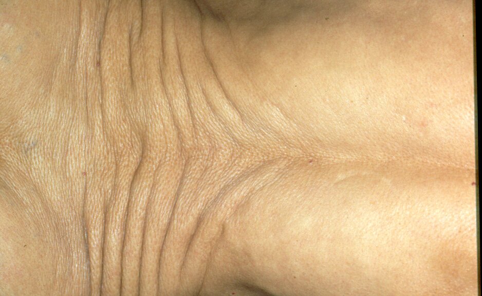 Mme B., ?g?e de 42 ans, pr?sente depuis 10 ans une dysphonie, des arthralgies et une dyspn?e associ?es ? des l?sions cutan?o-muqueuses diffuses. L'interrogatoire ne r?v?le pas d'ant?c?dents de dermatoses inflammatoires ni de prises m?dicamenteuses suspectes et l'enqu?te g?n?alogique ne trouve pas d'atteinte familiale. L'examen montre un faci?s pr?cocement vieilli avec une accentuation des rides p?ribuccaux et une infiltration de la peau du visage. Le tronc est le si?ge d'une peau l?che avec pt?se mammaire et gros plis cutan?s r?alisant un aspect en drap? au niveau des aisselles, des flancs et de la r?gion lombaire. Les paumes et les plantes sont parsem?es de multiples papules ros?es et jaun?tres associ?es ? un aspect scl?rodermiforme des doigts qui sont infiltr?s, boudin?s et recouverts d'une peau ?ryth?mateuse fine et luisante. Le reste de l'examen somatique trouve une macroglossie et les aires ganglionnaires sont libres. L'examen histopathologique d'une l?sion papuleuse de la paume montre apr?s coloration au rouge Congo un d?p?t amylo?de dermique, important, infiltrant les parois vasculaires et engainant les annexes avec un dichro?sme vert jaune en lumi?re polaris?e. La coloration ? l'orc?ine objective la disparition des fibres ?lastiques ? ce niveau. Une deuxi?me biopsie de la r?gion lombaire montre la pr?sence d'un d?p?t amylo?de dermique mod?r? avec des fibres ?lastiques qui sont rar?fi?es, dystrophiques et fragment?es au niveau du derme papillaire et inexistantes au niveau du derme profond. L'immuno?lectrophor?se s?rique d?couvre une gammapathie monoclonale de type IgG lambda et la prot?inurie de Bence-Jones est n?gative. La ponction sternale montre une moelle polymorphe avec plasmocytose mod?r?e ? 11?%. Une hypertrophie ventriculaire gauche est d?couverte ? l'?chographie cardiaque. La biopsie laryng?e montre la pr?sence d'un d?p?t amylo?de alors que les biopsies bronchiques et rectales se sont r?v?l?es normales.