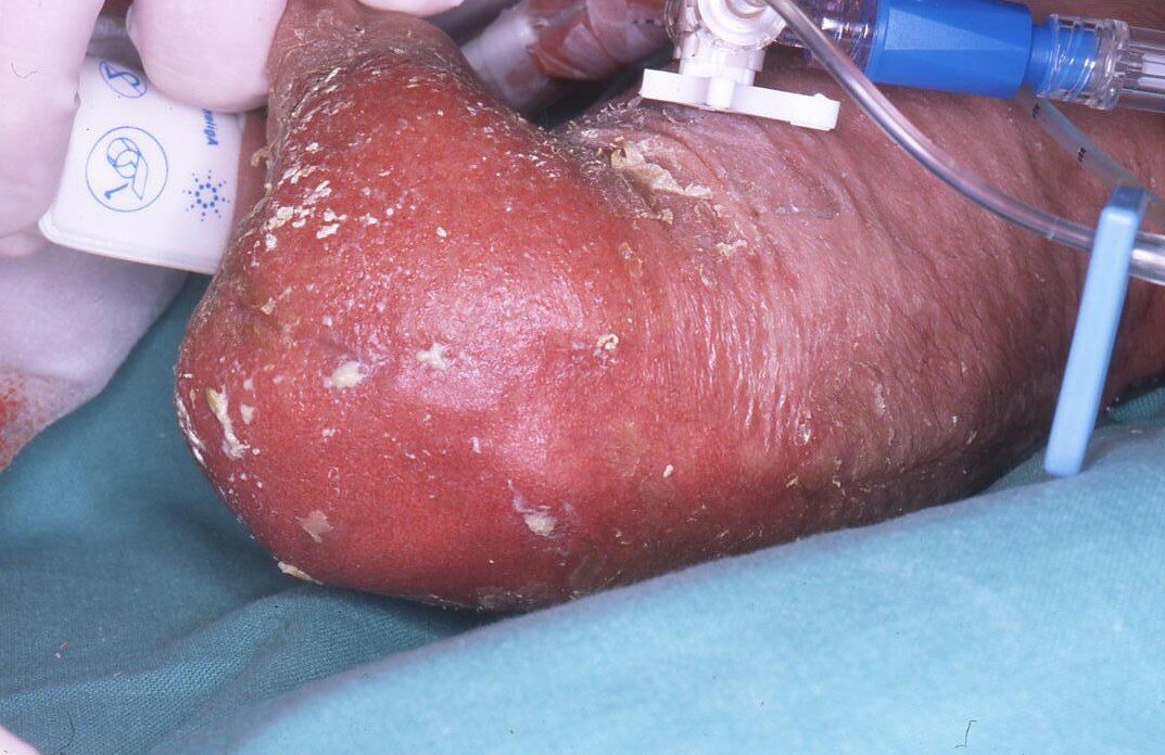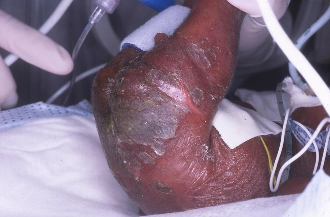 La candidose cutan?e invasive est une maladie du pr?matur? de moins de 1?000 grammes. Son aspect clinique ?voque une br?lure du premier degr? avec plaques mal limit?es, atteignant plus fr?quemment le bas du dos, le si?ge(plus volontiers les zones convexes des fesses), le thorax et l'abdomen. Parfois surviennent des ph?nom?nes de fissuration et d'?rosion. Le tableau prend parfois un aspect d?squamatif en lambeau pouvant alors en imposer pour une n?crolyse ?pidermique staphylococcique [1]. Les pustules satellites classiquement observ?es dans les intertrigos candidosiques sont absentes. Les facteurs de risques de cette affection sont l'accouchement par voie basse, l'administration de st?ro?des et l'hyperglyc?mie. La gravit? du tableau est conditionn?e par l'existence de localisations profondes. La peau est probablement la porte d'entr?e de l'infection car, ? ce stade du d?veloppement foetal, sa fonction de barri?re n'est pas encore totalement acquise. En effet, l'?piderme est alors fin avec peu d'assises cellulaires et les cr?tes ?pidermiques sont peu prononc?es. Ces particularit?s histologiques expliquent vraisemblablement la pr?sentation clinique. La prise en charge r?animatoire de ces nouveaux-n?s entra?ne des l?sions cutan?es permettant l'invasion puis la diffusion h?matog?ne du Candida albicans [2]. Le traitement repose sur des antifongiques intraveineux ainsi que des soins locaux antiseptiques. La baisse de l'incidence de ces candidoses invasives n?cessite des mesures visant ? renforcer la fonction de barri?re de la peau de ces grands pr?matur?s.