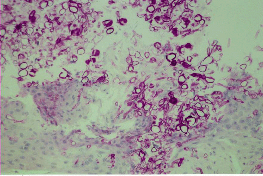 Les examens histologique et microbiologique des biopsies cutan?s r?v?laient la pr?sence du Fusarium moniliforme. La recherche des moisissures s'av?rait positive dans le liquide broncho-alv?olaire, les urines et la moelle osseuse (d?sertique malgr? l'usage des GM-CSF). Les pr?l?vements mycologiques des ongles ?taient n?gatifs. Le traitement par amphot?ricine B et flucytosine, puis par caspofongin ?tait inefficace. Au 66e jour, un traitement par voriconazole associ? ? l'amphot?ricine B et ? des transfusions leucocytaires ?tait instaur?.